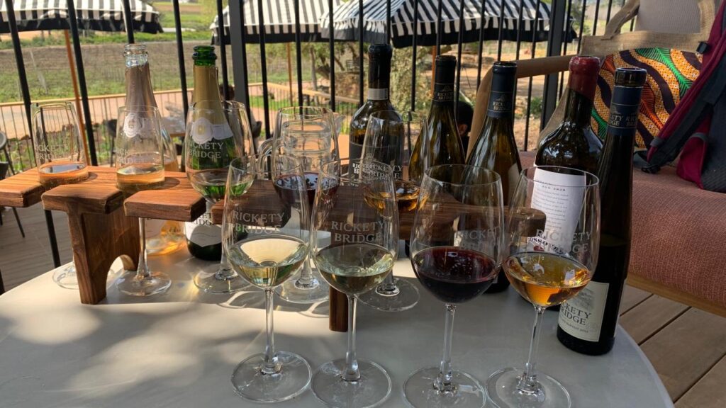 Em Franschoek, a história foi outra. Pegamos o trem que percorre diferentes vinhedos, sem planejamento detalhado. Ansiedade e dúvida surgiram, mas também a beleza das descobertas inesperadas. Uma dessas surpresas foi a Rickety Bridge, uma propriedade histórica que nasceu em 1694, parte da fazenda La Provence, e que em 1797 foi concedida a Paulina De Villiers — uma das primeiras mulheres a possuir terras na África do Sul. Foi lá que vivemos experiências marcantes: harmonizar queijos e vinhos, docinhos e vinhos, aprendendo a arte de combinar sabores, tempo e atenção.